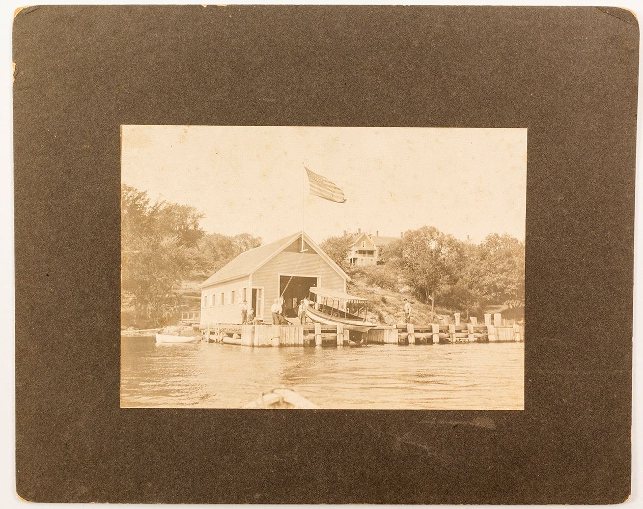Choice vintage photo of a boat on a boathouse ramp in Massachusetts, 42 star US flag (c.1890). By JR O'Hara, Jr. in Winthrop, Mass. Photo is 4.5" x 6.5", matting 8" x 10". Date: Location: Massachusetts HWAC # 54477