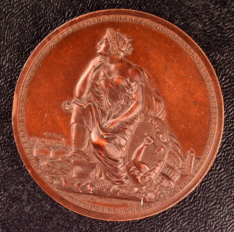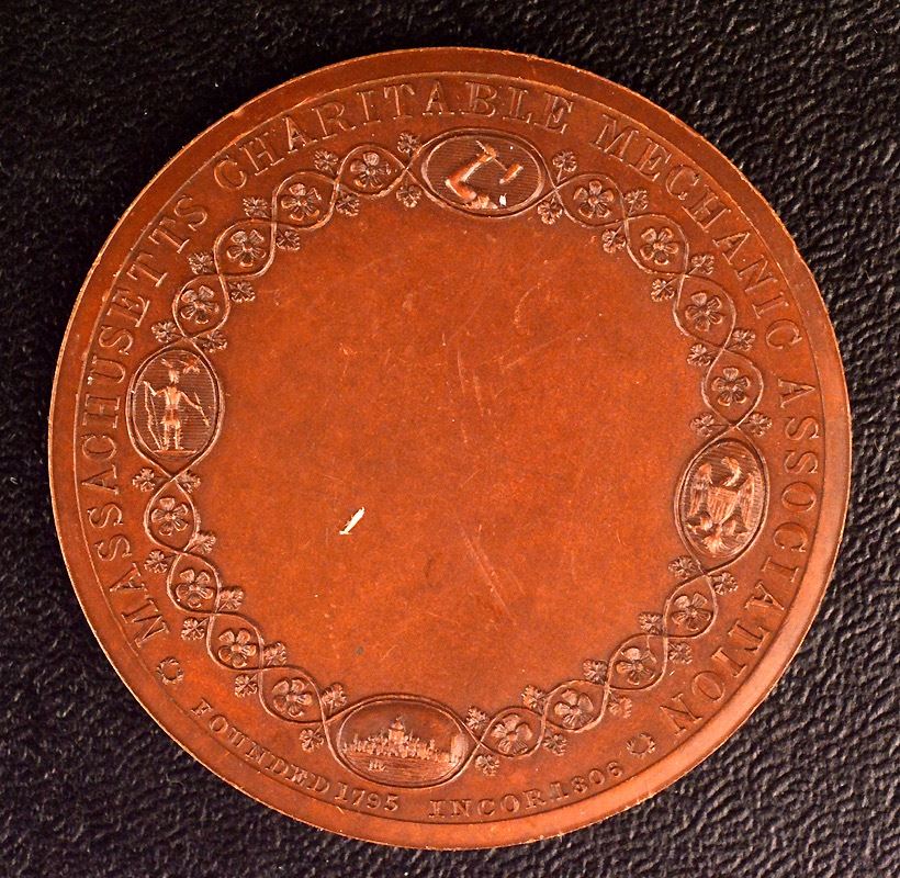 Obv: seated female figure facing left with attributes of science and industry; shield at right with arm and hammer and motto on scroll: "BE JUST AND/FEAR NOT." Rev: with laurel wreath; legend: ".MASSACHUSETTS CHARITABLE MECHANIC ASSOCIATION./FOUNDED 1795. INC. 1806."; Unpresented, Ae, 51mm, by FN. Mitchell. Good VF.