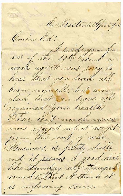 Letter from a civilian to his Union soldier cousin. Datelined ''E. Boston Apr. 20 /62,'' letter reads in part: ''...Cousin Ed: I rec'd your favor of the 10th about a week ago. I was sorry to hear that you had all been unwell, but am glad that you have all regained your health. There isn't much news now except what we get from the seat of war. Business is pretty dull, and it seems a good deal like Sunday all the week round. But I think it is improving some. How did you hear that I was tending in an Apothecary shop? Tis true I held forth during vacation in a friend's shop, but not with a view to adopt it as my business wanted to get a little insight in it, for perhaps it might come handy one of these odd days. But I am now spending the present term at College at home. I am kept pretty busy most of the time or should have answered your letter before this...'' 2pp. ink letter measures 3.75'' x 6''. Scattered soiling and foxing, otherwise near fine condition.