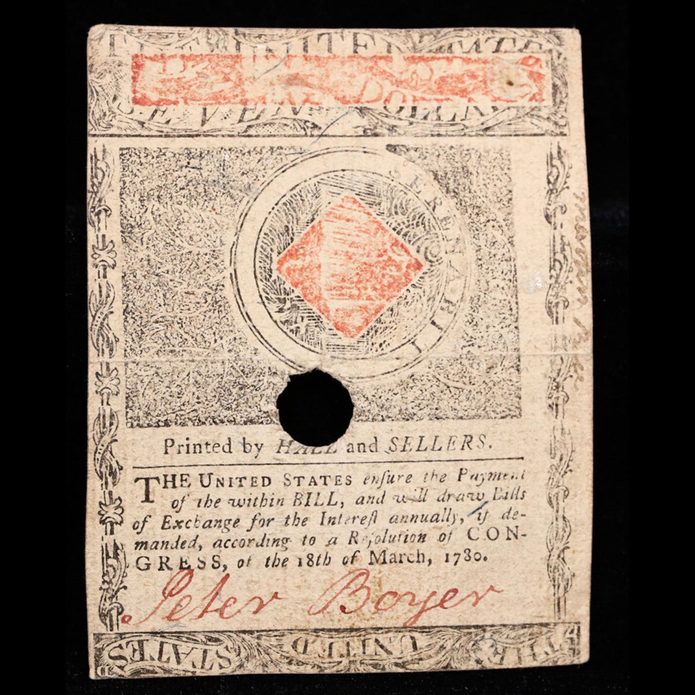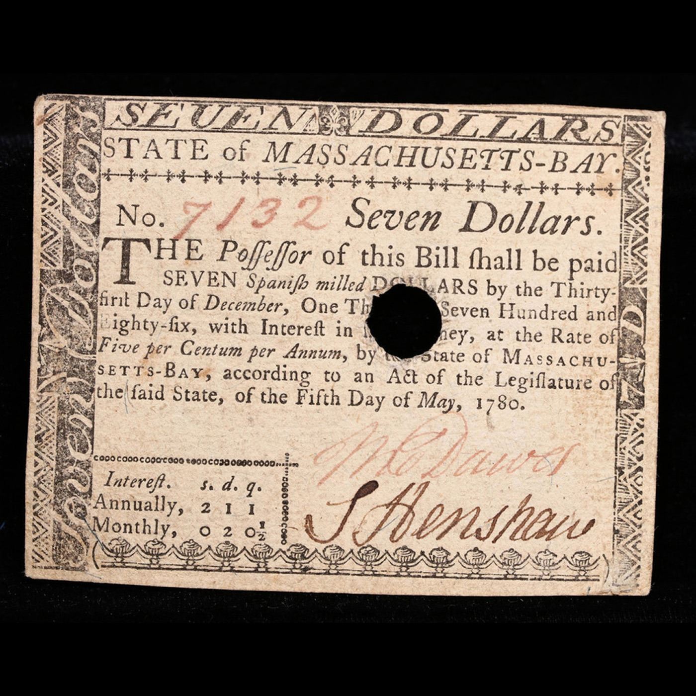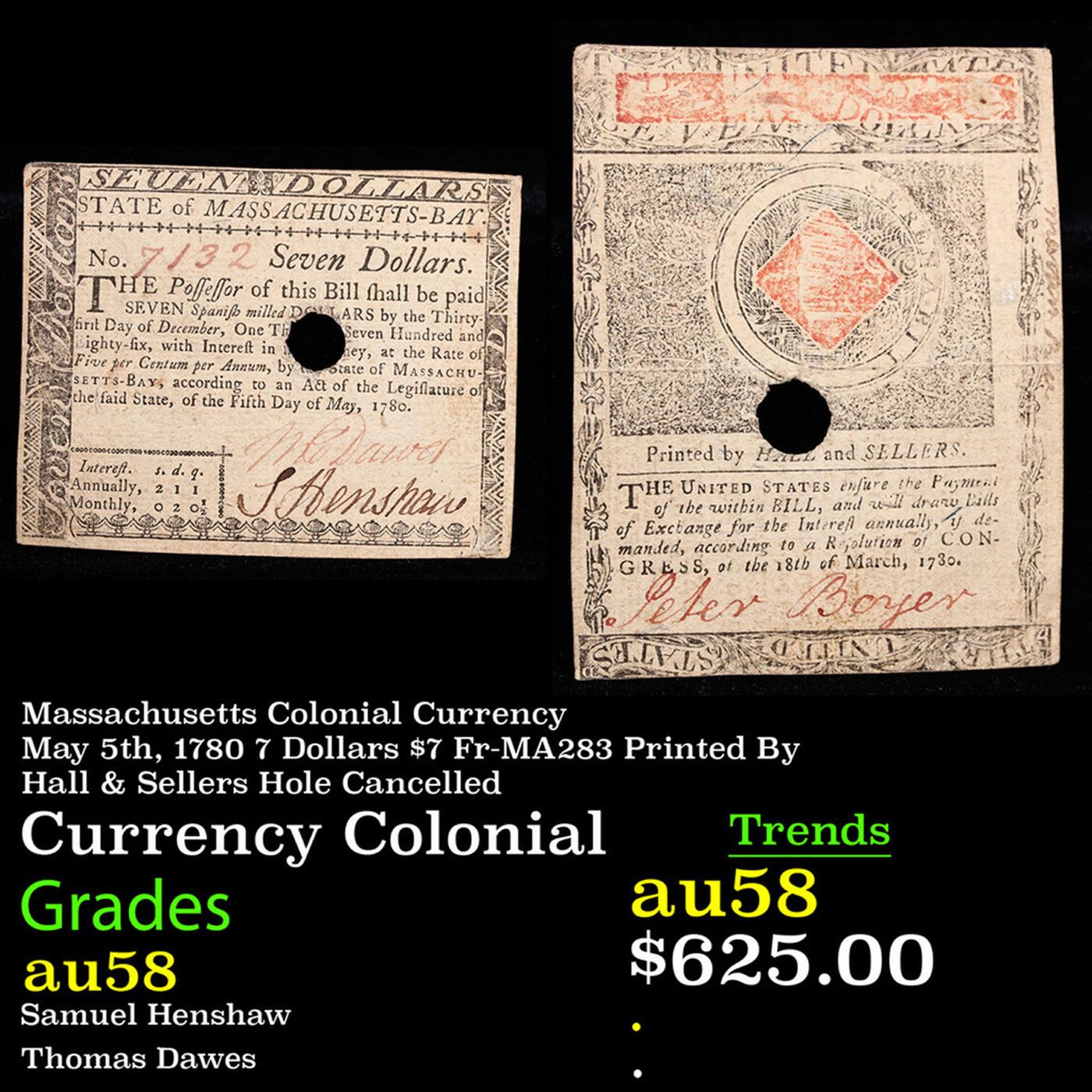Massachusetts Colonial Currency May 5th, 1780 7 Dollars $7 Fr-MA283 Printed By Hall & Sellers Hole Cancelled Grades Choice AU/BU Slider.