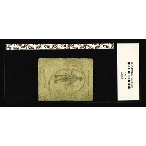 <B>Massachusetts December 7, 1775 1s/4d PCGS Apparent Fine 15.</B></I> In a PCGS red holder, with the comment, "restored split at center." The work has been very well done, and the note has an excellent overall appearance for the assigned grade. It's a solid example with a strong back vignette. While none of the notes from this issue can be considered common, it is our experience that these lower denominations are seen with considerably less frequency. This piece is #4802 out of only 6,250 printed. No counterfeits were made of the lower denominations, so the tedious process of deciding genuineness becomes moot.