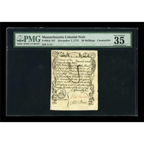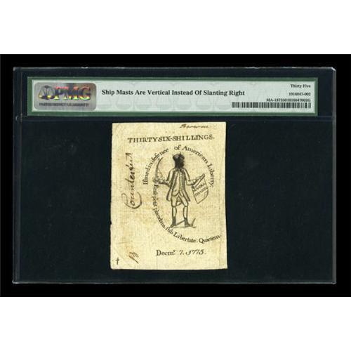 <B>Massachusetts December 7, 1775 36s Contemporary Counterfeit PMG Choice Very Fine 35.</B></I> This is one of the more deceptive contemporary counterfeits and the highest grade example that we have handled. The note is well printed, well signed, and clearly circulated, at least briefly, alongside the genuine notes. The note has the look of a genuine example and is distinguished from the genuine only by minute differences in engraving. The easiest ones to spot are the straight vertical main masts on the ship vignette. On the genuine examples, the masts slant to the right. An unusually bright, clean and very attractive note that will not realize anywhere near the $7,000 or so that a genuine in this grade would realize. Pen cancelled on front, with counterfeit written on back and penned "X" on soldier's face.<BR><BR><b>Shipping:</b> Coins & Currency (<a target="_blank" href="http://www.heritageauctions.com/common/shipping.php">view shipping information</a>)