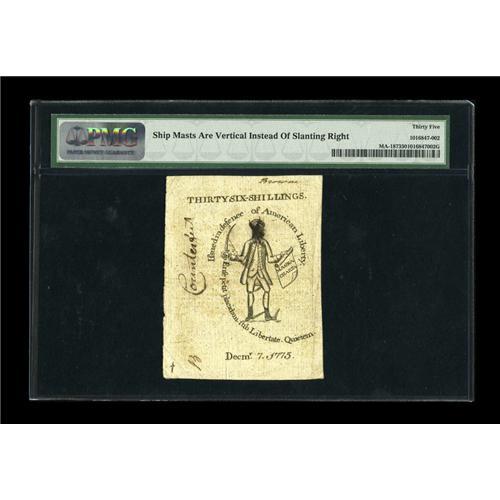 <B>Massachusetts December 7, 1775 36s PMG Choice Very Fine 35.</B></I> This is one of the more deceptive contemporary counterfeits and the highest grade example that we have handled. The note is well printed, well signed, and clearly circulated, at least briefly, alongside the genuine notes. The note has the look of a genuine example and is distinguished from the genuine only by minute differences in engraving. The easiest ones to spot are the straight vertical main masts on the ship vignette. On the genuine examples, the masts slant to the right. An unusually bright, clean and very attractive note that will not realize anywhere near the $7,000 or so that a genuine in this grade would realize. Pen cancelled on front, with counterfeit written on back and penned "X" on soldier's face.<BR><BR><b>Shipping:</b> Coins & Currency (<a target="_blank" href="http://www.heritageauctions.com/common/shipping.php">view shipping information</a>)