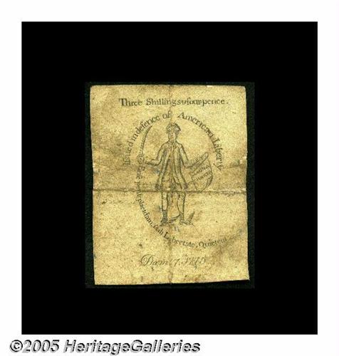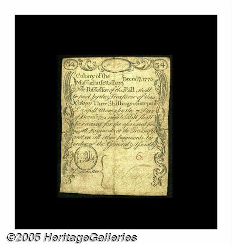<B>Massachusetts December 7, 1775 3s/4d Choice Very Fine.</B></I> A lightly circulated but lovely example of this rare and important issue. All the design on both sides is clean and perfect, and the all-important vignette with the Revolutionary soldier with a raised sword on the back is beautifully printed and as sharp as we've ever seen. The plates for this note were engraved by Paul Revere, and the printing for both sides was done in his shop. A truly great piece of Americana, to be enjoyed not just by the Colonial Currency collector but also by anyone who appreciates the early history of our country. This December 7, 1775 issue was heavily counterfeited, but only in the higher denominations. This piece is genuine beyond a doubt, and problem-free save for a little soil and the red penned number six on a blank area of the face.