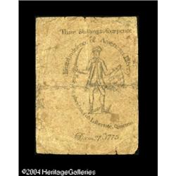 Massachusetts December 7, 1775 3s/4d Fine. There are a <B>Massachusetts December 7, 1775 3s4d Fine.</B></I> There are a number of restorations at the edges and along the folds. The two upper corners have also been rather well replaced, but the note is almost entirely legible and the Continental soldier vignette on the back is remarkably clear for a piece in this grade. <BR><BR><B>Important notice:</B> Heritage usually auctions material at the rate of 200-250 lots per hour. On some occasions eBay Live bid software or the Internet may not be able to keep up with the pace of the auction. We recommend placing a realistic absentee bid now as insurance to avoid disappointment. Occasionally the auctioneer may eliminate or reject an eBay Live bid, and the auctioneer may also reopen a lot after the close of the eBay live bidding (usually because we missed an audience bid), and may reject your bid even if it shows you as the winning bidder. By bidding via eBay Live, you agree that Heritage may award the lot to another bidder at its sole discretion under the circumstances described above or any other reasonable circumstances. Since eBay bids are not shown to us until we open the lot on the floor, we treat those bids just like floor bids. In most cases the floor responds before the eBay bid is presented to us, due to Internet lag time, so for consistency we have made it a policy that floor bids are always considered first over tie eBay live bids. Also please note that all Heritage lots purchased through eBay Live carry a 20% Buyer's Premium. Please make sure you read the Terms and Conditions before you bid. This lot is being auctioned in conjunction with a live floor auction by Heritage Galleries & Auctioneers. All final auction and invoice information will be supplied by Heritage Galleries & Auctioneers, and all other information should be considered preliminary. Lot:15139
