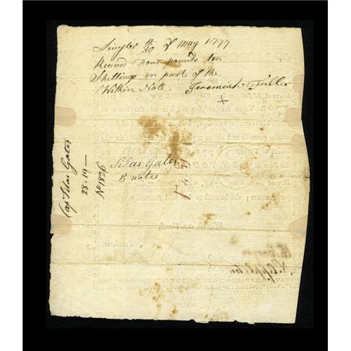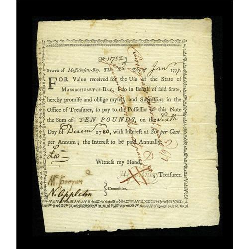 <B>Massachusetts January 28, 1777 Bounty Note.</B></I> Signed by Cooper and Appleton as committee and Gardner as Treasurer. This document grades <B>Very Fine or better</B></I> and measures 6 1/2" by nearly 8". Listed as an R-4 in Anderson.