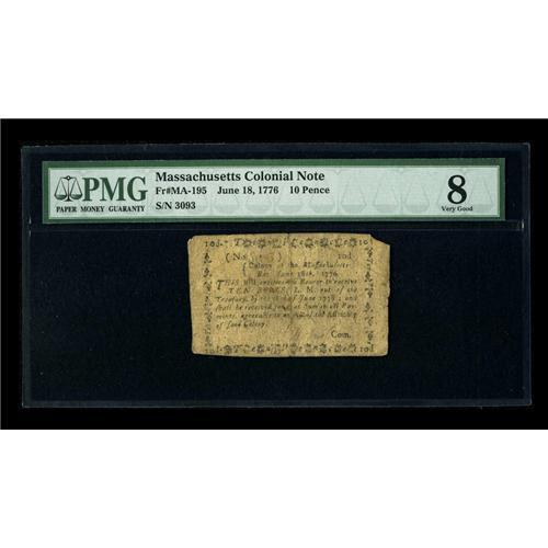 <B>Massachusetts June 18, 1776 10d PMG Very Good 08.</B></I> This piece is perfect for the budget minded collector looking to fill their collection with this scarce issue.<BR><BR><b>Shipping:</b> Coins & Currency (<a target="_blank" href="http://www.heritageauctions.com/common/shipping.php">view shipping information</a>)