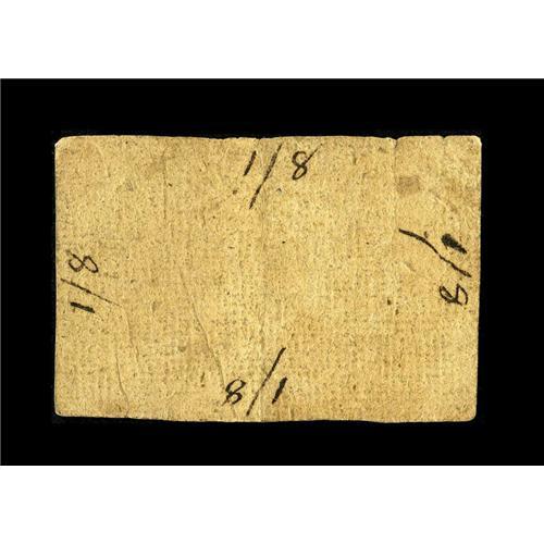 <B>Massachusetts June 18, 1776 1s/8d Fine-Very Fine.</B></I> The center fold is a touch weak, though the note faces up well. The signature of D. Hopkins remains. On back, the denomination is scribbled on all four edges of the note, expressed simply as 1/8. We do not recall having seen this on any note before now.<BR><BR><b>Shipping:</b> Coins & Currency (<a target="_blank" href="http://www.heritageauctions.com/common/shipping.php">view shipping information</a>)