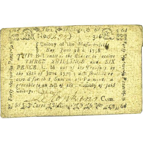 Massachusetts June 18, 1776 3s/6d About New. A single l