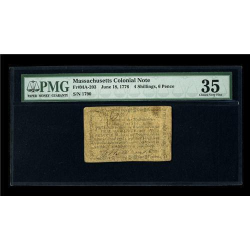 <B>Massachusetts June 18, 1776 4s/6d PMG Choice Very Fine 35.</B></I> This is the first time a note of this type has appeared at auction with us in over five years. The signature and serial number remain legible.<BR><BR><b>Shipping:</b> Coins & Currency (<a target="_blank" href="http://www.heritageauctions.com/common/shipping.php">view shipping information</a>)
