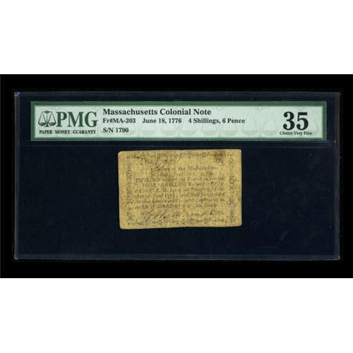 <B>Massachusetts June 18, 1776 4s/6d PMG Choice Very Fine 35.</B></I> This is the first time a note of this type has appeared at auction with us in over five years. The signature and serial number remain legible. <BR><BR><b>Shipping:</b> Coins & Currency (<a target="_blank" href="http://www.heritageauctions.com/common/shipping.php">view shipping information</a>)