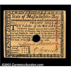 Massachusetts May 5, 1780 $20 Gem New. But for its small central hole cancel, this fully signed Mass