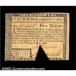 Massachusetts May 5, 1780 $5 About New. Three examples of the same denomination and issue, each with a large wedge cancel cut through the signature block. All three notes grade About New. 3 notes Important notice: We expect to be auctioning lots at the rate of 200-250 per hour. Sometimes eBay Premier live bid software cannot keep up with that pace, so we strongly recommend that you place a realistic proxy bid now as insurance to avoid disappointment. Also please note that all Heritage/CAA lots purchased through eBay Premier carry a 20% Buyer's Premium. Please make sure you read the Terms and Conditions.