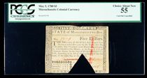 Massachusetts May 5, 1780 $5. PCGS Choice About New 55. A nicely margined, fully-signed note that retains good color. A cut-out cancel is seen.