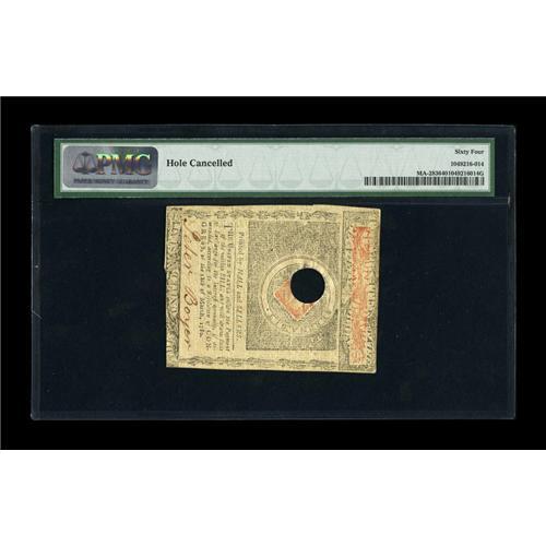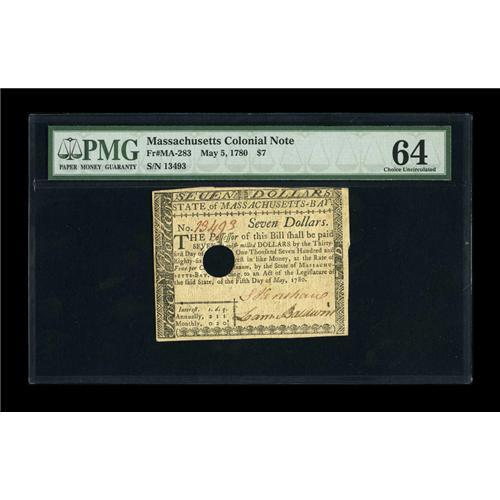 <B>Massachusetts May 5, 1780 $7 PMG Choice Uncirculated 64.</B></I> PMG comments "Hole Cancelled," which on this note is a somewhat smaller hole than the normal nickel-sized hole. The note is bright, well-margined, and boldly signed.<BR><BR><b>Shipping:</b> Coins & Currency (<a target="_blank" href="http://www.heritageauctions.com/common/shipping.php">view shipping information</a>)