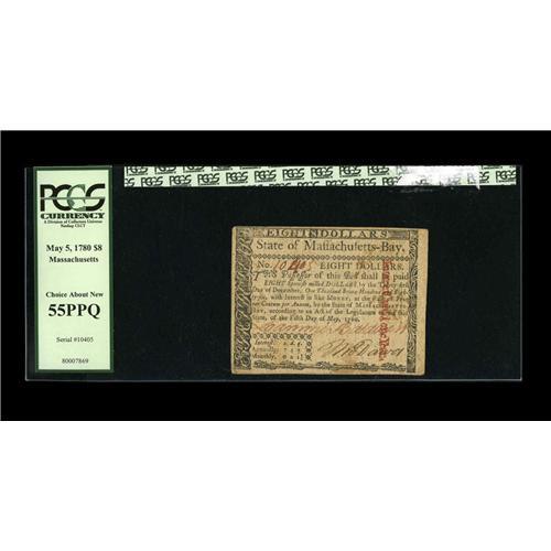 <B>Massachusetts May 5, 1780 $8 PCGS Choice About New 55PPQ.</B></I> A very common issue, but not in this fully signed and uncanceled form. It's a well margined piece, signed on the back by Peter Boyer for the United States.
