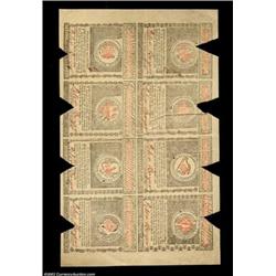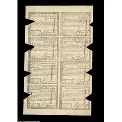 Massachusetts May 5, 1780 Sheet of Eight. This is the first example we've seen of a fully signed, issued Massachusetts Guaranteed multiple. Each note has its two signatures on the face and is signed by Peter Boyer on the back for the United States. The sheet consists of one of each of the following denominations: $1, $2, $3, $4, $5, $7, $8 and $20. Each note has a small crosscut cancel in the body and a large wedge cancel at its edge. Each note bears the red "Interest Paid One Year" stamp. But for their cancels, seven of the eight notes are perfect Gems. The $7 note has a wrinkle in it. Extremely rare and desirable. Important notice: We expect to be auctioning lots at the rate of 200-250 per hour. Sometimes eBay Premier live bid software cannot keep up with that pace, so we strongly recommend that you place a realistic proxy bid now as insurance to avoid disappointment. Also please note that all Heritage/CAA lots purchased through eBay Premier carry a 20% Buyer's Premium. Please make sure you read the Terms and Conditions.