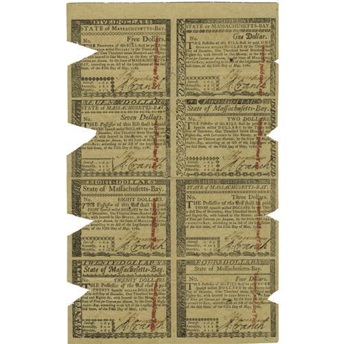 <B>Massachusetts May 5, 1780 Uncut Sheet of Eight $5, $1, $7, $2, $8, $3,$20, $4 Very Fine-Extremely Fine.</B></I> These notes have the "Interest Paid One Year" red stamping on them. The edges show cut-out-cancels of varying degrees. Closer examination also reveals that this is actually a top and bottom half joined by three small pieces of stamp hinge tape. Each note has also been cancelled with small punch holes.<BR><BR><b>Shipping:</b> Coins & Currency (<a target="_blank" href="http://www.heritageauctions.com/common/shipping.php">view shipping information</a>)