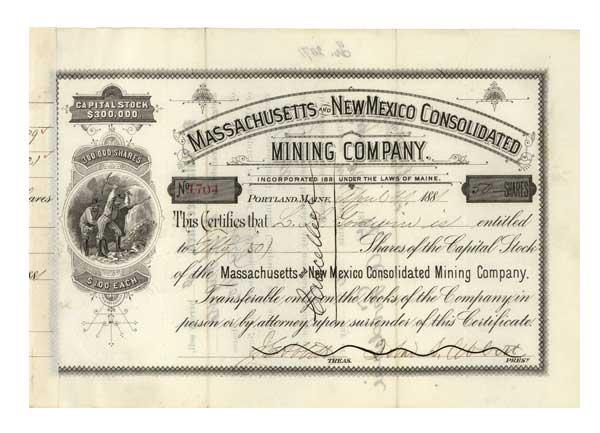 1881. Massachusetts. Stock certificate for 500 Shares. Black. Vignettte of miners working at left. Pen cancelled. Very fine.