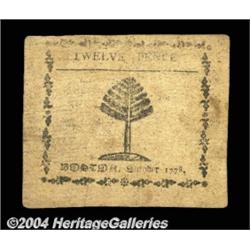 Massachusetts October 16, 1778 12d Extremely Fine. A beautiful Paul Revere-engraved Codfish note, lightly circulated but absolutely problem free. Unlike most of the type, the margins are large and even all around, and the face printing is bold and razor sharp. <BR><BR><B>Important notice:</B> Heritage usually auctions material at the rate of 200-250 lots per hour. On some occasions eBay Live bid software or the Internet may not be able to keep up with the pace of the auction. We recommend placing a realistic absentee bid now as insurance to avoid disappointment. Occasionally the auctioneer may eliminate or reject an eBay Live bid, and the auctioneer may also reopen a lot after the close of the eBay live bidding (usually because we missed an audience bid), and may reject your bid even if it shows you as the winning bidder. By bidding via eBay Live, you agree that Heritage may award the lot to another bidder at its sole discretion under the circumstances described above or any other reasonable circumstances. Since eBay bids are not shown to us until we open the lot on the floor, we treat those bids just like floor bids. In most cases the floor responds before the eBay bid is presented to us, due to Internet lag time, so for consistency we have made it a policy that floor bids are always considered first over tie eBay live bids. Also please note that all Heritage lots purchased through eBay Live carry a 20% Buyer's Premium. Please make sure you read the Terms and Conditions before you bid. <BR><BR><B>IMPORTANT ANNOUNCEMENT ABOUT RESERVES:</B> Heritage now divulges all reserves on its web site 7 days before every auction. If you want to know whether the reserve on this lot has been met, and if not, what the reserve amount is, please visit this lot page on the HeritageCoin.com web site, or email: bid@HeritageGalleries.com
