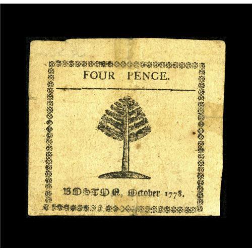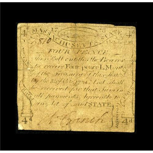 <B>Massachusetts October 16, 1778 4d Very Fine.</B></I> This is a desirable and popular issue where the important Codfish and Pine Tree designs are well printed, and one of only a couple that we have handled in this denomination. The technical grade for this note is Very Fine or better as there really are not many folds in the paper but the face is uniformly toned and there are some clear tape remnants which subtly mask a couple of edge tears.<BR><BR><b>Shipping:</b> Coins & Currency (<a target="_blank" href="http://www.heritageauctions.com/common/shipping.php">view shipping information</a>)