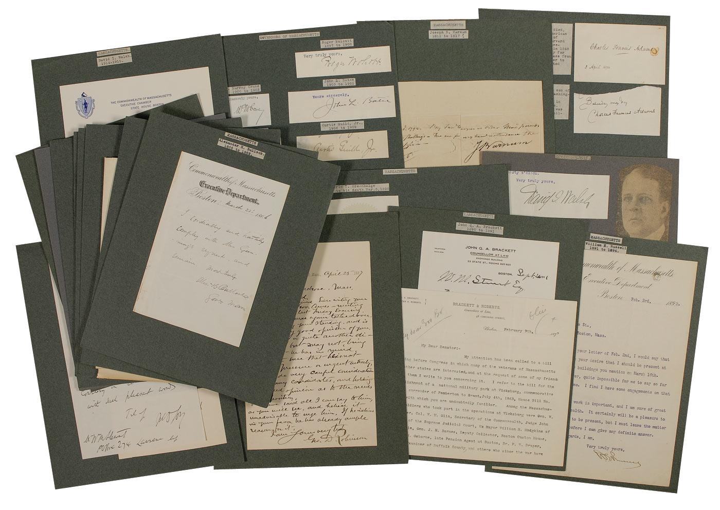 Collection of twenty-seven items, consisting of signatures on cards and clipped slips, TLSs, ALSs, LSs, and documents, each signed by a different former Massachusetts politician, including many former governors. Signers are: Charles Francis Adams (2), Joseph B. Varnum, Roger Wolcott, W. Murray Crane, John L. Bates, William Douglas, Curtis Guild, Jr., Eben Draper, Eugene Foss, David Walsh (2), William E. Russell, Frederic Greenhalge, John Q. A. Brackett, George D. Robinson, John D. Long (2), Thomas Talbot, Alexander H. Rice, William Claflin, Alexander H. Bullock, Henry J. Gardiner, John H. Clifford, John Davis (2), and Marcus Morton. All items are affixed to 8.5 x 11 green scrapbook pages, many one to a page. In very good overall condition.