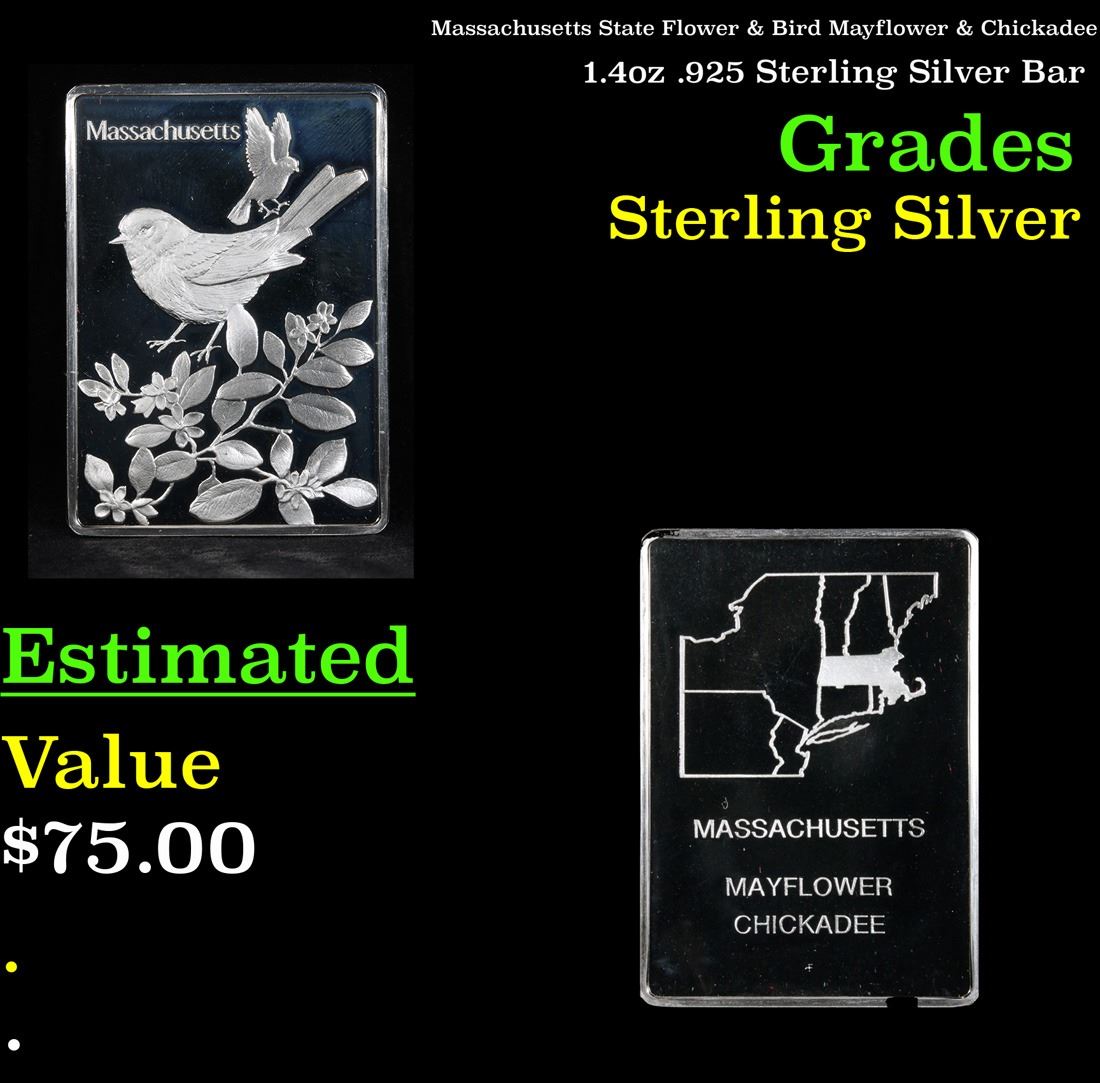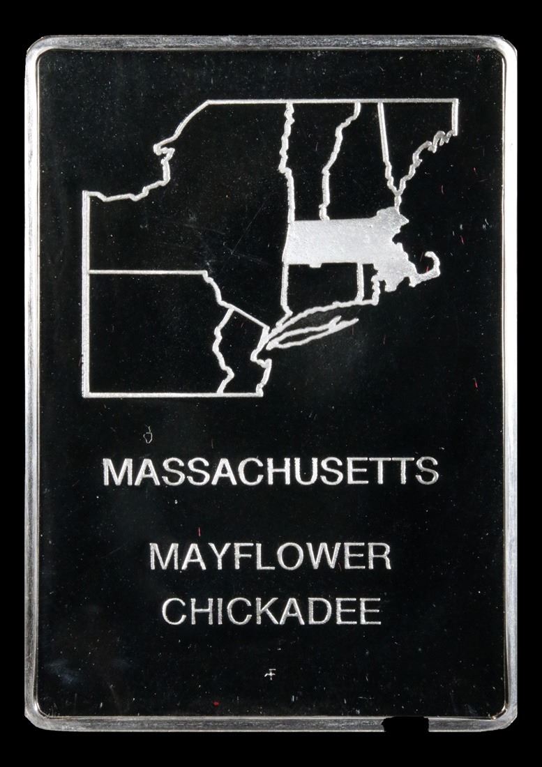 Massachusetts State Flower & Bird Mayflower & Chickadee . . 1.4oz .925 Sterling Silver Bar Grades. This set is also known as the National Governor's Conference State Ingots. We will be bringing the entire set to you throughout all of our Fall Extravaganza auction. There is one ingot for each state, which shows the state bird and flower. Very impressive and attractive as a complete set. This is the "Massachusetts" Bar which has The Mayflower & Chickadee, The Official Bird and Flower of the sate of Arizona. This specimen is struck .925 fine silver (marked on the edge STERLING) and measures 1 & 1/2 by 2 & 1/8 inches with a total weight of 40.75 grams and an actual silver weight of 1.2 oz
