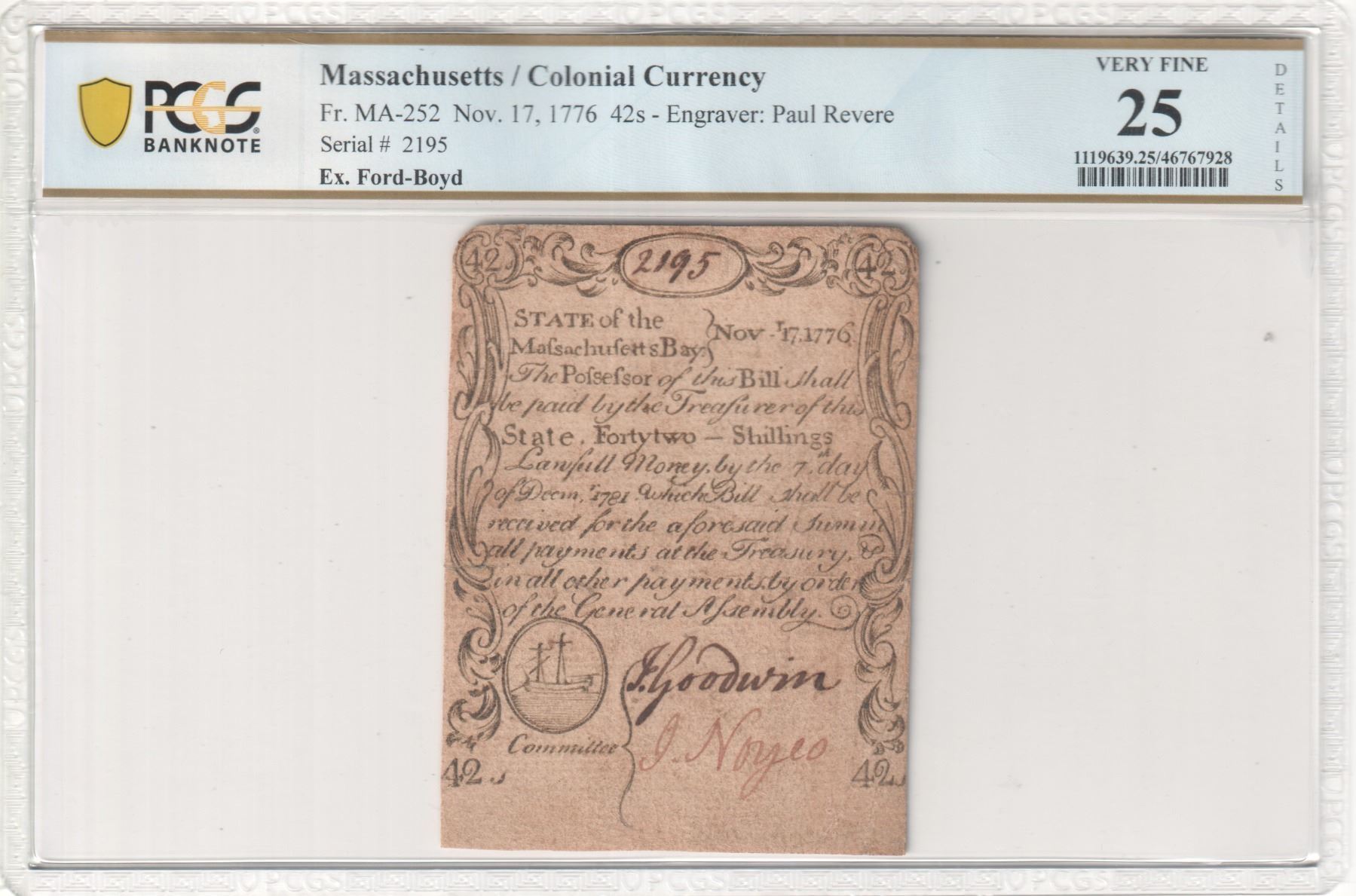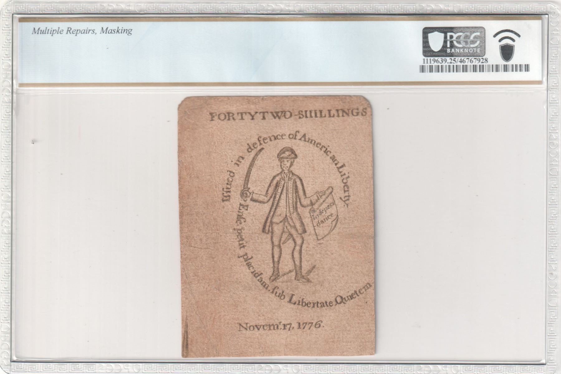 Massachusetts State. November 17, 1776. Forty Two Shillings. Fr. MA-252. PCGS Very Fine-25 Details. Multiple Repairs, Masking. As illustrated.
