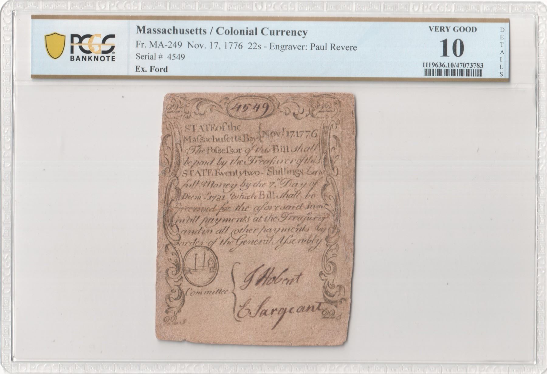 Description: Rigid thick stock. Serial No. 4549. Signed by Hobart and Sergeant. 78mm by 101mm. Two-sided, engraved and printed by Paul Revere. Well-worn but still an attractive note with decent centering and excellent aesthetics in spite of the lower grade assigned by PCGS. Some paper has been added to bolster earlier edge problems. This note has been secured and safe in an advanced cabinet for years, and the minimal curation has left behind a note that yields solid overall eye appeal today. A note like this offers a grand entry-level piece for a beginning enthusiast in the early American paper money discipline.