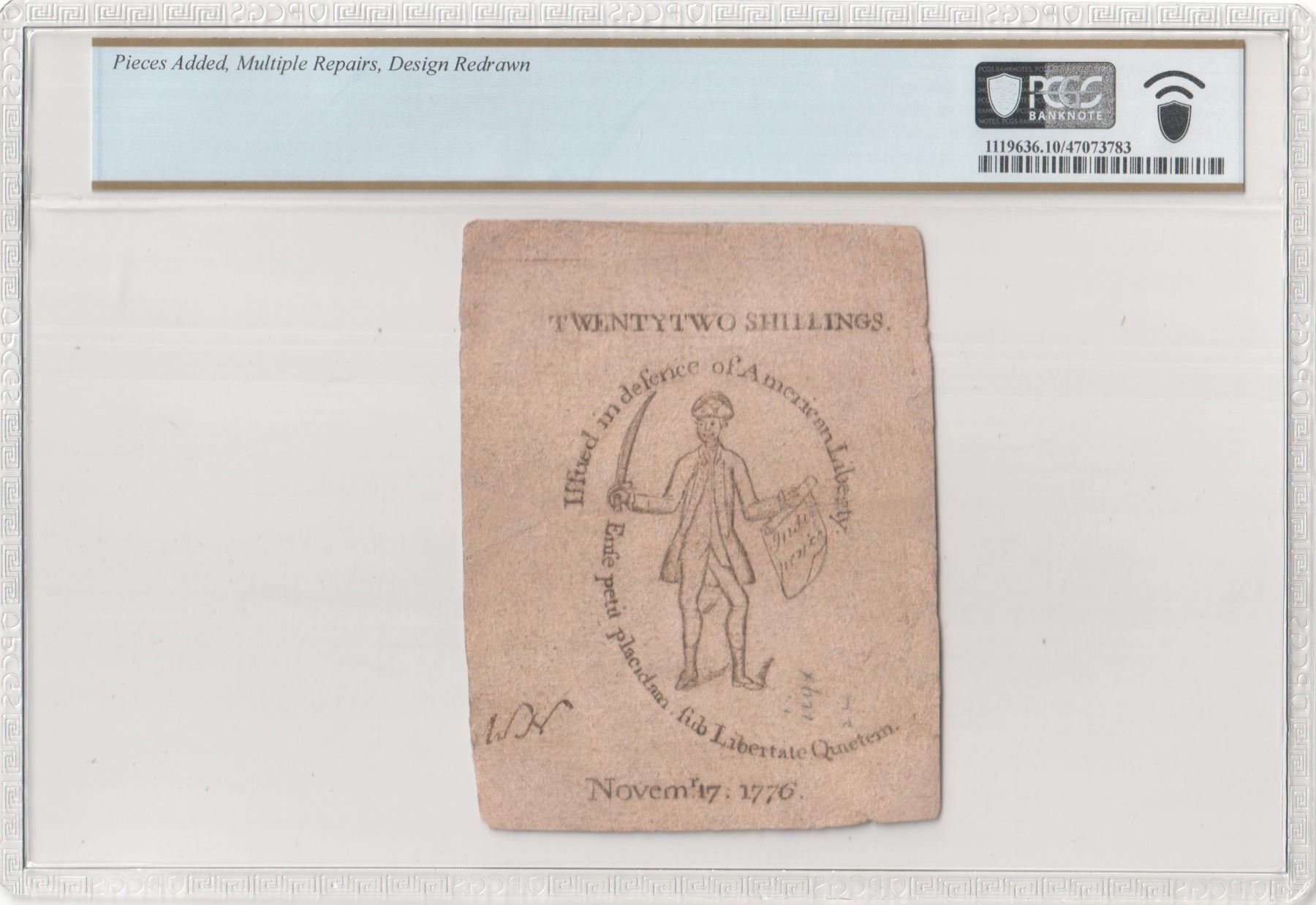 Massachusetts State. November 17, 1776. Twenty Two Shillings. Fr. MA-249. PCGS Very Good-10 Details. Pieces Added, Multiple Repairs, Design Redrawn . As illustrated.