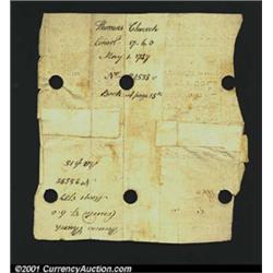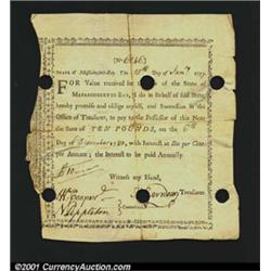 Massachusetts Treasury Certificate 1777 Extremely Fine.<p>MA 6 in the Anderson reference, this certificate had been split both ways at its center folds and repaired with paper tape on the back. Interestingly, these repairs were done before May 1, 1787, as it is clear that the back endorsements as well as the cancels were added on top of the repair. Important notice: We expect to be auctioning lots at the rate of 200-250 per hour. Sometimes eBay Premier live bid software cannot keep up with that pace, so we strongly recommend that you place a realistic proxy bid now as insurance to avoid disappointment. Also please note that all Heritage/CAA lots purchased through eBay Premier carry a 20% Buyer's Premium.