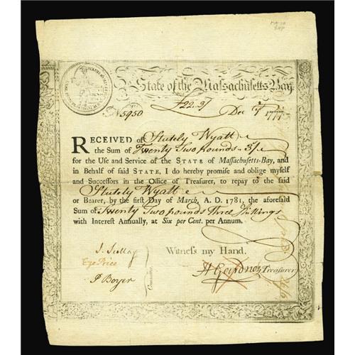 <B>Massachusetts Treasury Certificate Mar. 1, 1781 Very Fine.</B></I> This MA-10 has four old-time repairs.
