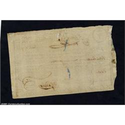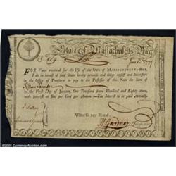 Massachusetts Treasury Certificate, 6% Interest due January 1, 1783 Extremely Fine.<p>A second, identical to the above but with a light stain and a bit of glue on the back. Important notice: We expect to be auctioning lots at the rate of 200-250 per hour. Sometimes eBay Premier live bid software cannot keep up with that pace, so we strongly recommend that you place a realistic proxy bid now as insurance to avoid disappointment. Also please note that all Heritage/CAA lots purchased through eBay Premier carry a 20% Buyer's Premium.