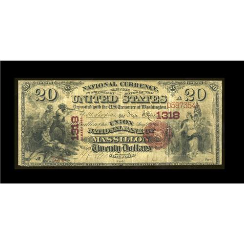 <B>Massillon, OH</B></I> - $20 1875 Fr. 434 <B>The Union NB</B></I> Ch. # 1318<BR>This is one of only two First Charters known from this none too common bank, and the sole $20. Although well circulated, the colors are bright and the note is fully intact save for a miniscule chip off the bottom left corner tip that is clear of the design and affects absolutely nothing. <B>Very Good-Fine.</B></I>