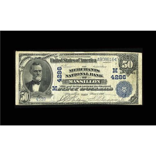 <B>Massillon, OH</B></I> - $50 1902 Date Back Fr. 670 <B>The Merchants NB</B></I> Ch. # (M)4286<BR>A <B>Fine-Very Fine</B></I> example of the increasingly elusive $50 1902 Date Back. Not quite 70 of this type and denomination have been traced for the entire state. Tonight's example will likely sell for about...<BR><I>From The Bill and Kathy Stella Currency Collection</B></I><BR><BR><b>Shipping:</b> Coin/Currency (<a target="_blank" href="http://www.heritageauctions.com/common/shipping.php">view shipping information</a>)
