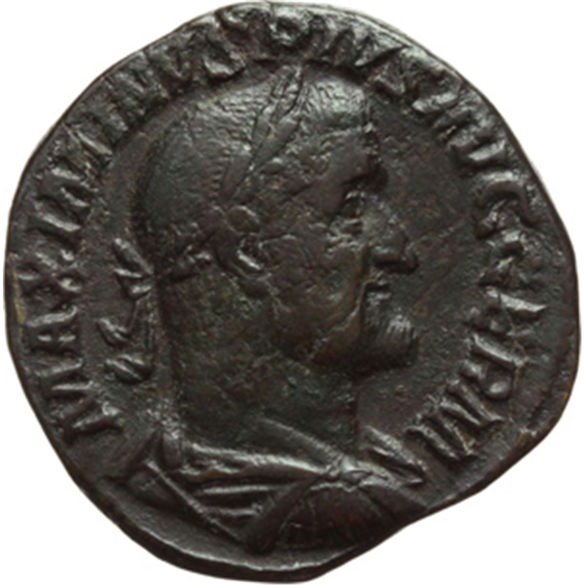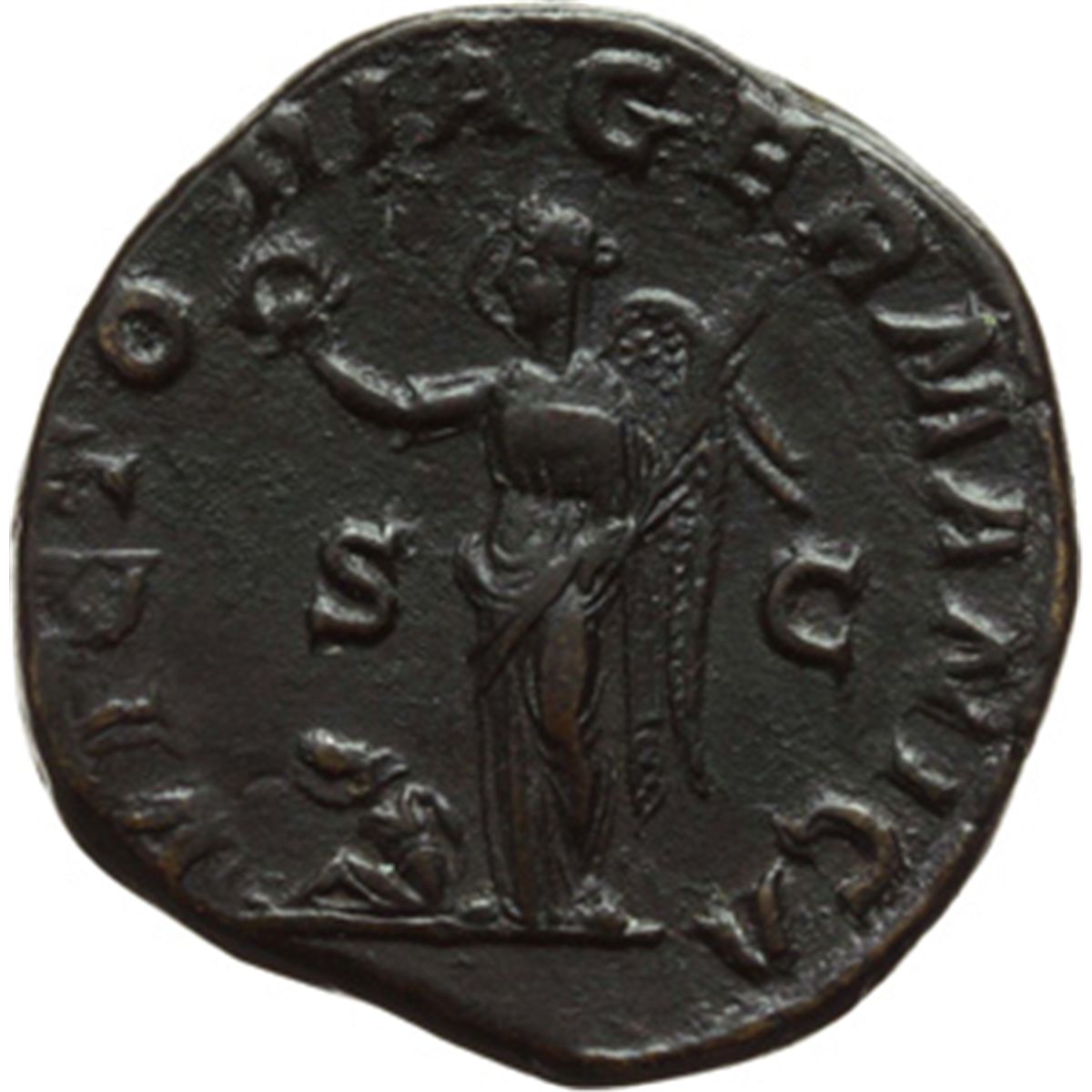 Impero Romano. Massimino I (235-238). Sesterzio. D/ MAXIMINVS PIVS AVG GERM. Busto laureato, drappeggiato e corazzato a destra. R/ VICTORIA GERMANICA SC. Vittoria stante a sinistra tiene corona e ramo di palma. Ai suoi piedi, un prigioniero seduto. RIC 90. AE. g. 15.78 mm. 29.00 BB/qSPL.