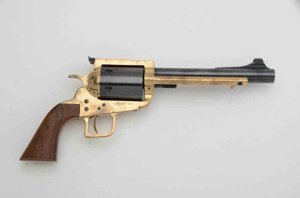 Massive Century Mfg. Model 500 “The Mother Load” single action revolver, .50-70 cal., 8-1/4” barrel, blue finish to barrel and cylinder, brass frame and straps, wood grips, #031. This custom made revolver is inoverall fine condition showing little use; majority of blue remaining, fine bore, crisp action, sharp markings, fine grips; accompanied by factory instructions packet and cardboard box. Est.: $1,500-$2,500.