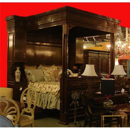Massive Custom Made Bed is perfect for any King or Queen. Lovely canopy with fabric and gold detailing besets the elegance of this piece. Hand Carved built-in's make this beauty difficult for anyone to get out of bed. The perfect Oasis for any home.