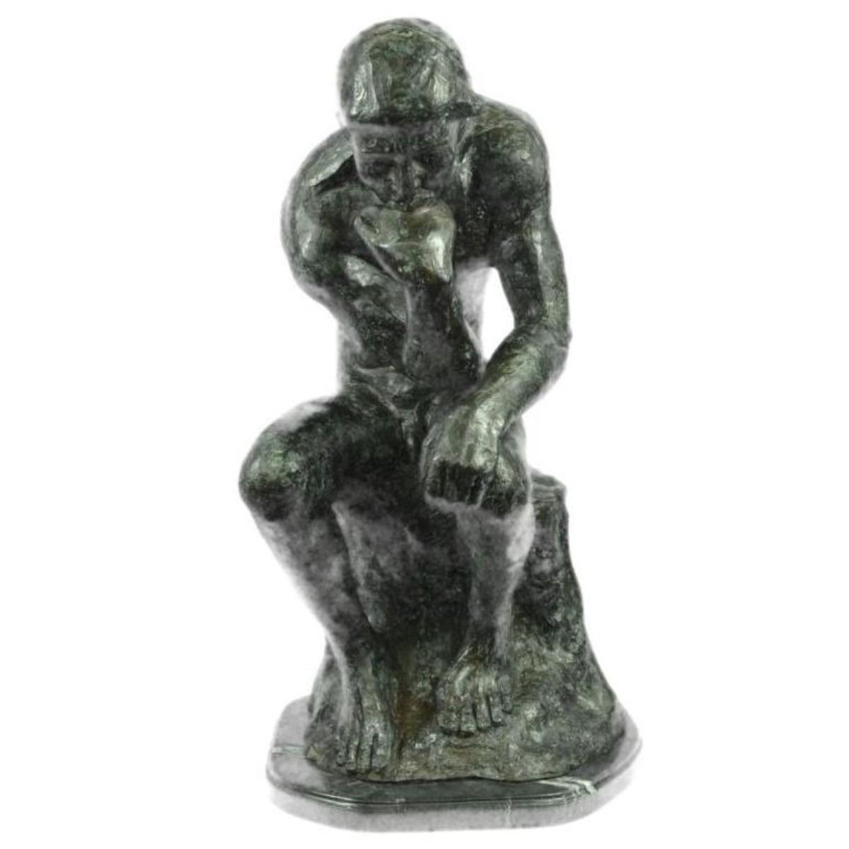 Massive bronze sculpture, created after Rodin's famous "Thinker" sculpture. The original statue was named "The Poet at first, created in 1880 for a doorway surround called "The Gates of Hell." Rodin based thison Dante's Divine Comedy to represent Dante as he pondered his great poem. Lost wax casting method bronze, with green patina, mounted on a marble base. 24" H X 13 1/2" W. 45lbs.