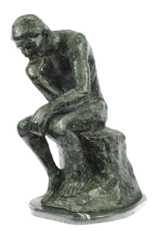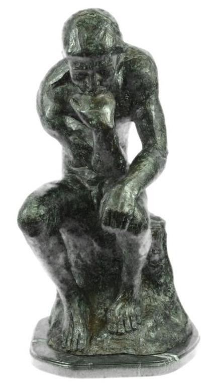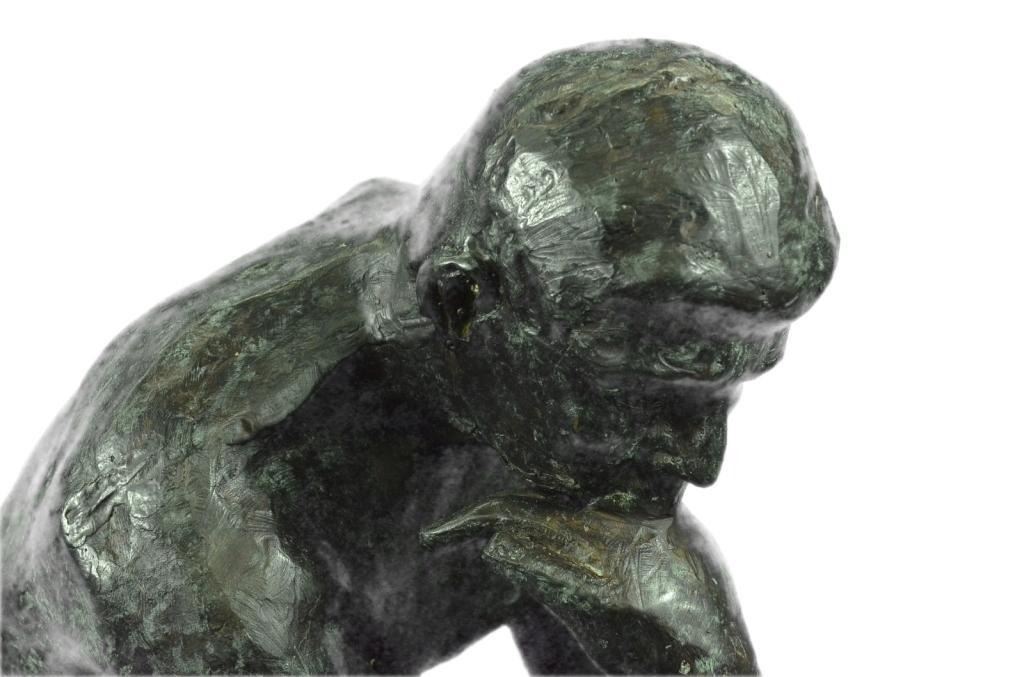 Massive bronze sculpture, created after Rodin's famous "Thinker" sculpture. The original statue was named "The Poet at first, created in 1880 for a doorway surround called "The Gates of Hell." Rodin based thison Dante's Divine Comedy to represent Dante as he pondered his great poem. Lost wax casting method bronze, with green patina, mounted on a marble base. 24" H X 13 1/2" W. 45lbs.