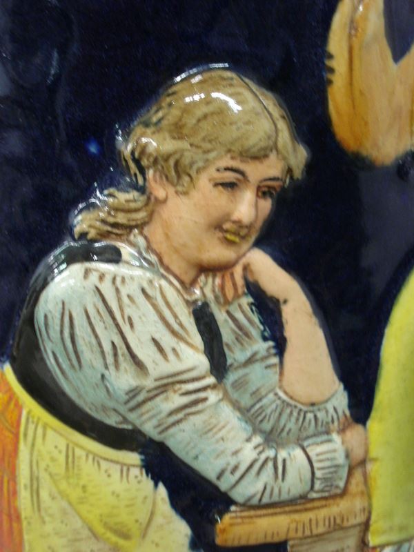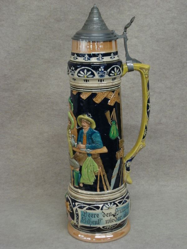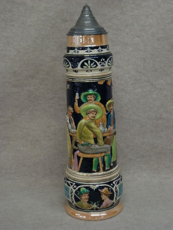 Massive German beer stein 26.5"H, main figure is of three men at a table with a maiden leaning on th