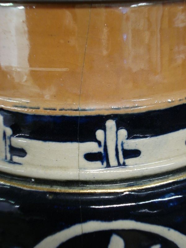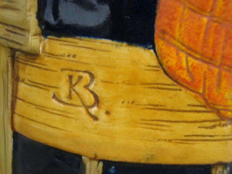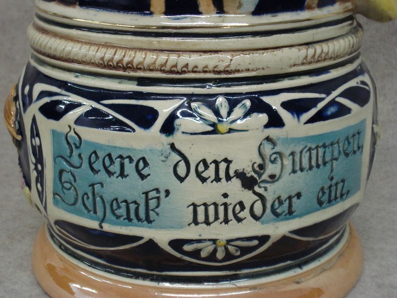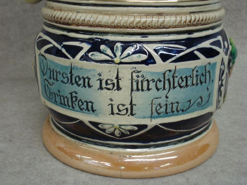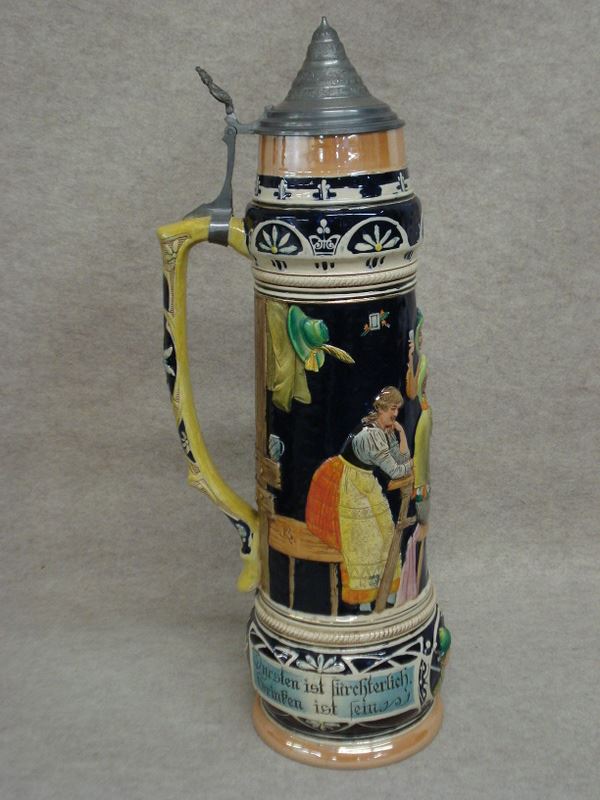 Massive German beer stein 26.5"H, main figure is of three men at a table with a maiden leaning on the table with her chin on her hand. The numbers 058 are on the side near the handle and KB is found within the carved figures near maiden. There are some stress cracks at base and one near the rim, the handle has an early repair. Overall condition is very good.