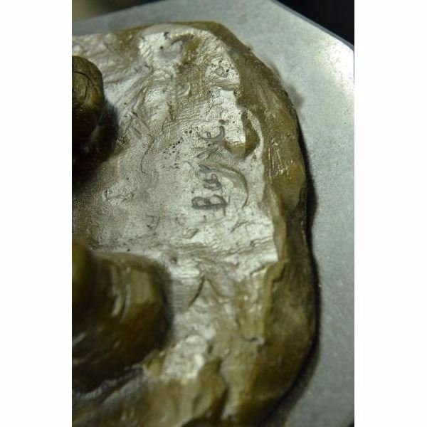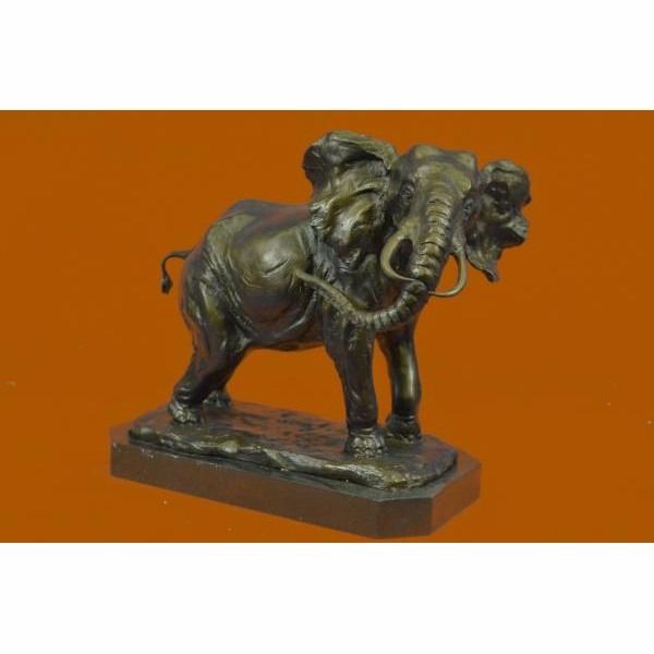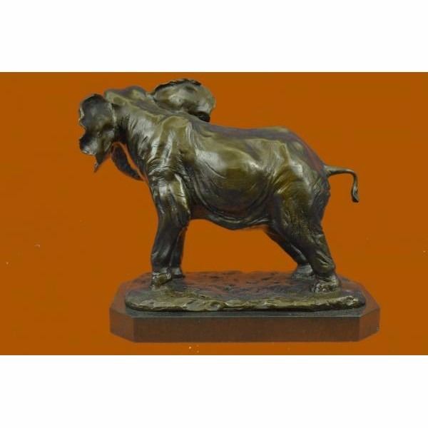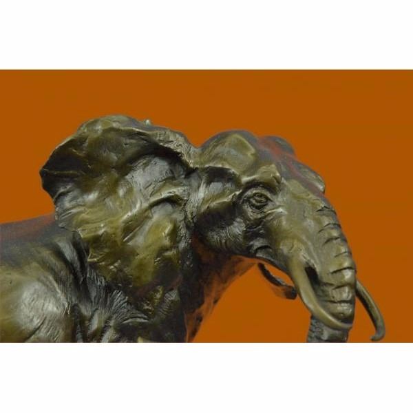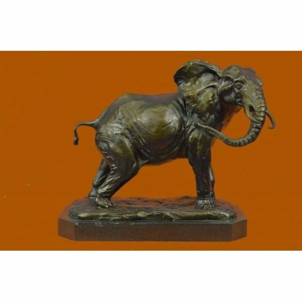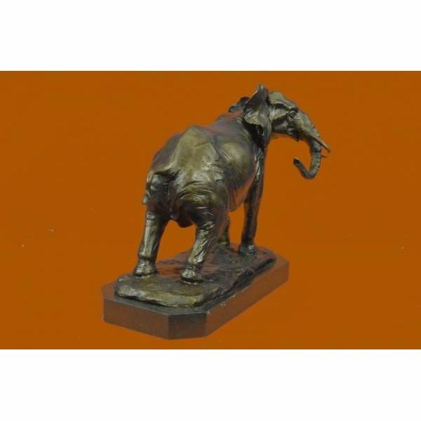 The elephant can be envisioned trekking slowly and majestically across the ceaseless dryness of a plain in search of a watering hole or the shade of tree. He pulls his trunk upward as he passes on by with a tender passivity to his eyes. For years the elephant has been known as a sacred animal in the East. As the largest animal to walk the Earth, the elephant is known as a symbol of strength and power. In Buddhist cultures, white elephants are symbolic of patience and wisdom. The Chinese see elephants as a symbol of energy, strength, and power. Ganesha is a Hindu deity with an elephant's head. The bronze sculpture was molded using the ancient method of lost-wax casting and stained with a brown patina finish for preservation. The elephant is mounted upon a variegated green marble base with the artist Barye's signature. Condition: This sculpture is in perfect condition. Bronze Dimensions with Marble Base:Height 11" x Width 13" Marble Dimensions: 12" X 6" Height without base: 10" Weight : 20 LBS Inventory : 25YDW1918752