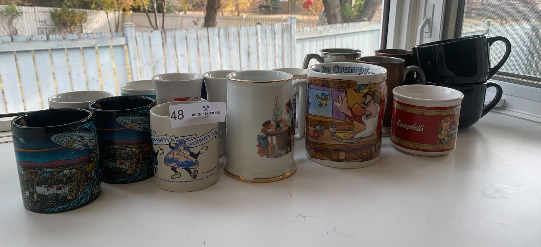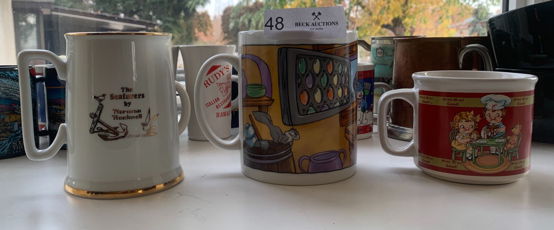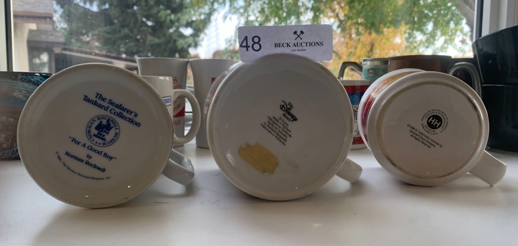 Massive Mug Collection. Includes Campbell's Soup mug, huge Disney Snow White Grumpy mug, and Norman Rockwell "For a Good Boy" mug.