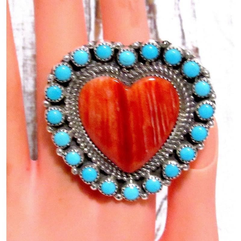 Massive Navajo Cluster Heart Ring Red Spiny & Turquoise Sterling Size 8 Adjustable