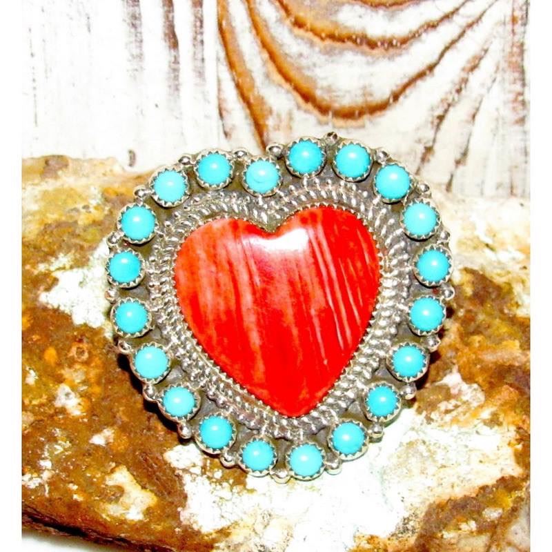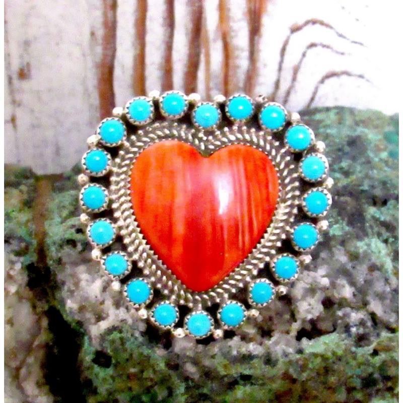 For your consideration is this spectacular massive Native American Navajo sterling silver, red spiny & turquoise cluster heart ring adjustable size 8 by the Navajo artist Geraldine Jones. This fabulous ring features a traditional Navajo cluster design of beautiful red spiny heart in the center and Sleeping Beauty mine turquoise stones around set in sterling silver. The ring is signed by the artist and is marked for silver silver. The ring is size 8 and can be adjusted. The front of the ring measures about 2. Stunning example of Native American art to add to any collection! FREE SHIPPING ON ALL JEWELRY ORDERS WITHIN THE US!