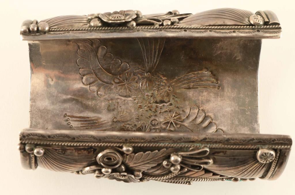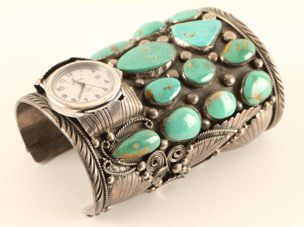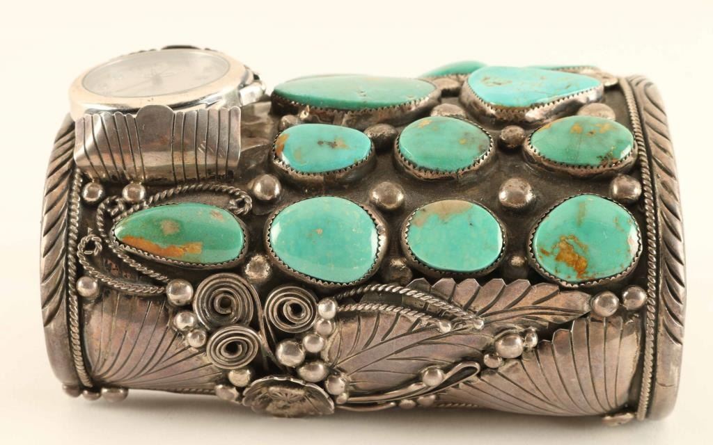 set with several large turquoise stones set in sterling with working Wilson watch, signed GB. 5.5"Tx8"W with a 2"gap.