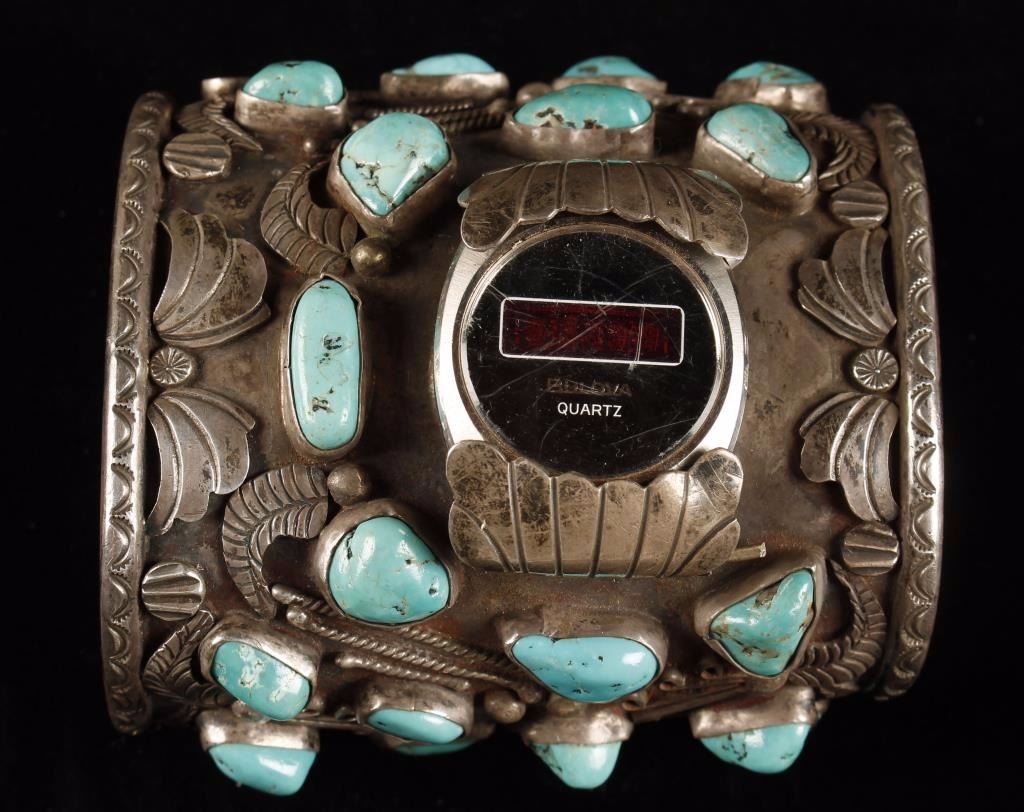 Accented with turquoise cabs and feather design. Unsigned, very heavy.