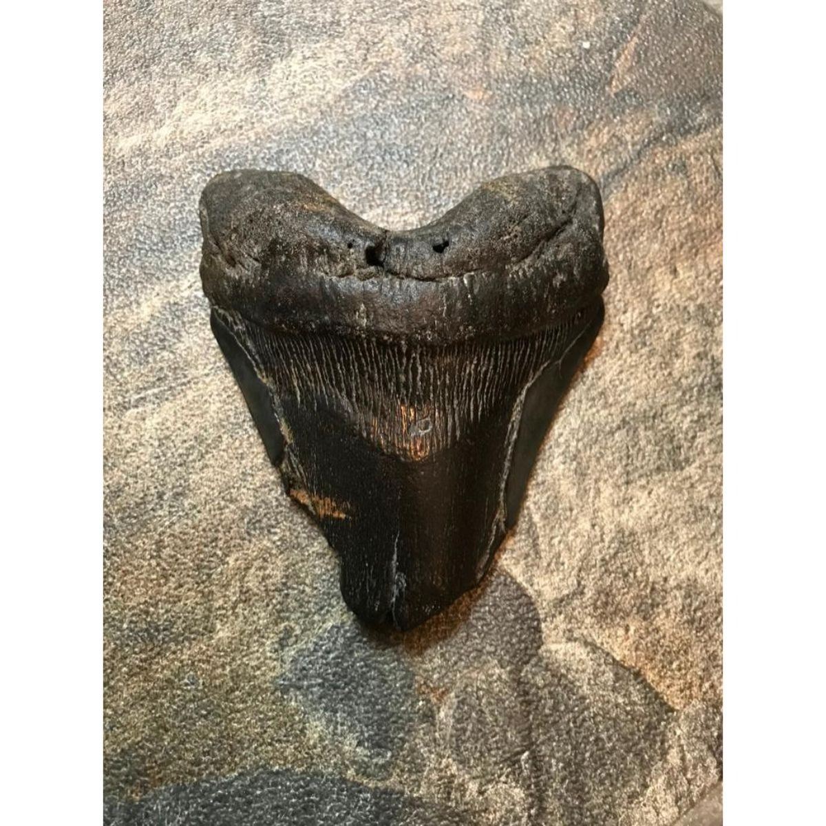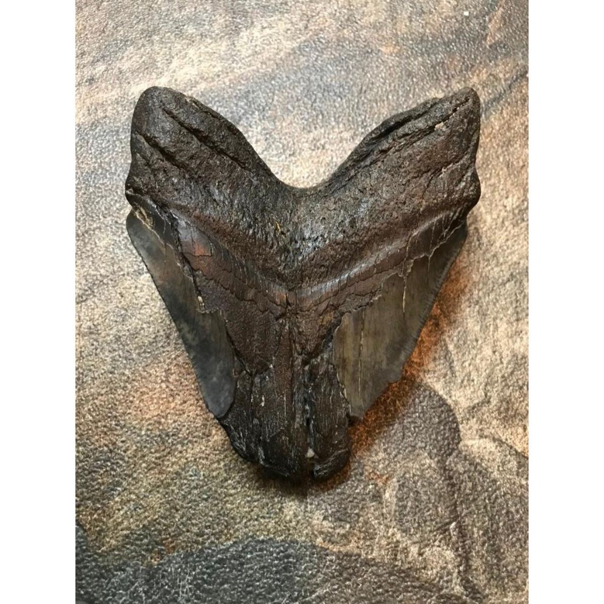 Found on a "blackwater dive" off the coast of Port Royal, South Carolina. 4 1/4" massive Prehistoric Megalodon Shark's Tooth fossil specimen in unrestored condition.Â
