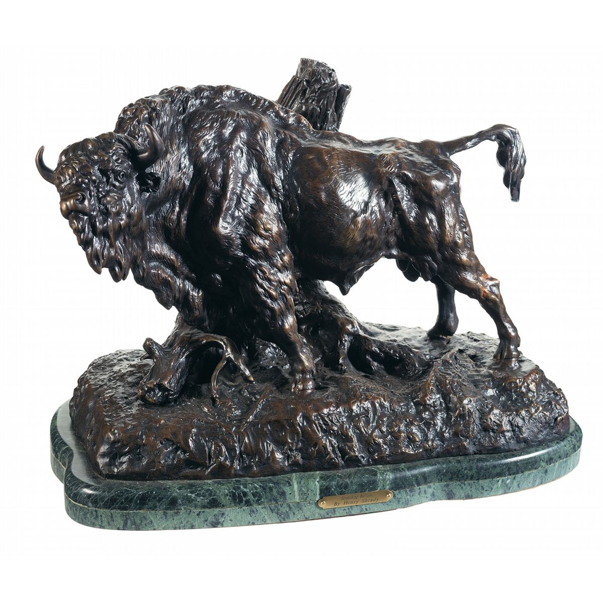This fantastic western sculpture employs the early naturalistic depiction of a giant bull buffalo scratching his backside along a tree trunk. The buffalo is peering forward looking for hidden dangers. The obverse of the buffalo is stamped "ROMAN BRONZE WORKS N-Y". It is signed "H.M. SHRADY" 1902" (Am: 1871-1922). This bronze rests on a massive contoured green marble plinth. The bronze measures 18 inches high x 14 inches wide x 24 inches long. Weighs 100 pounds.
